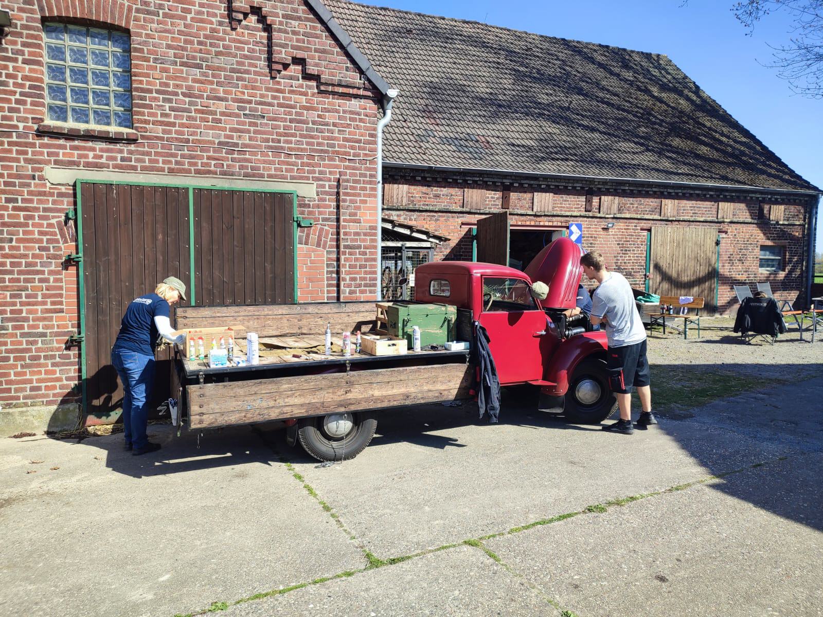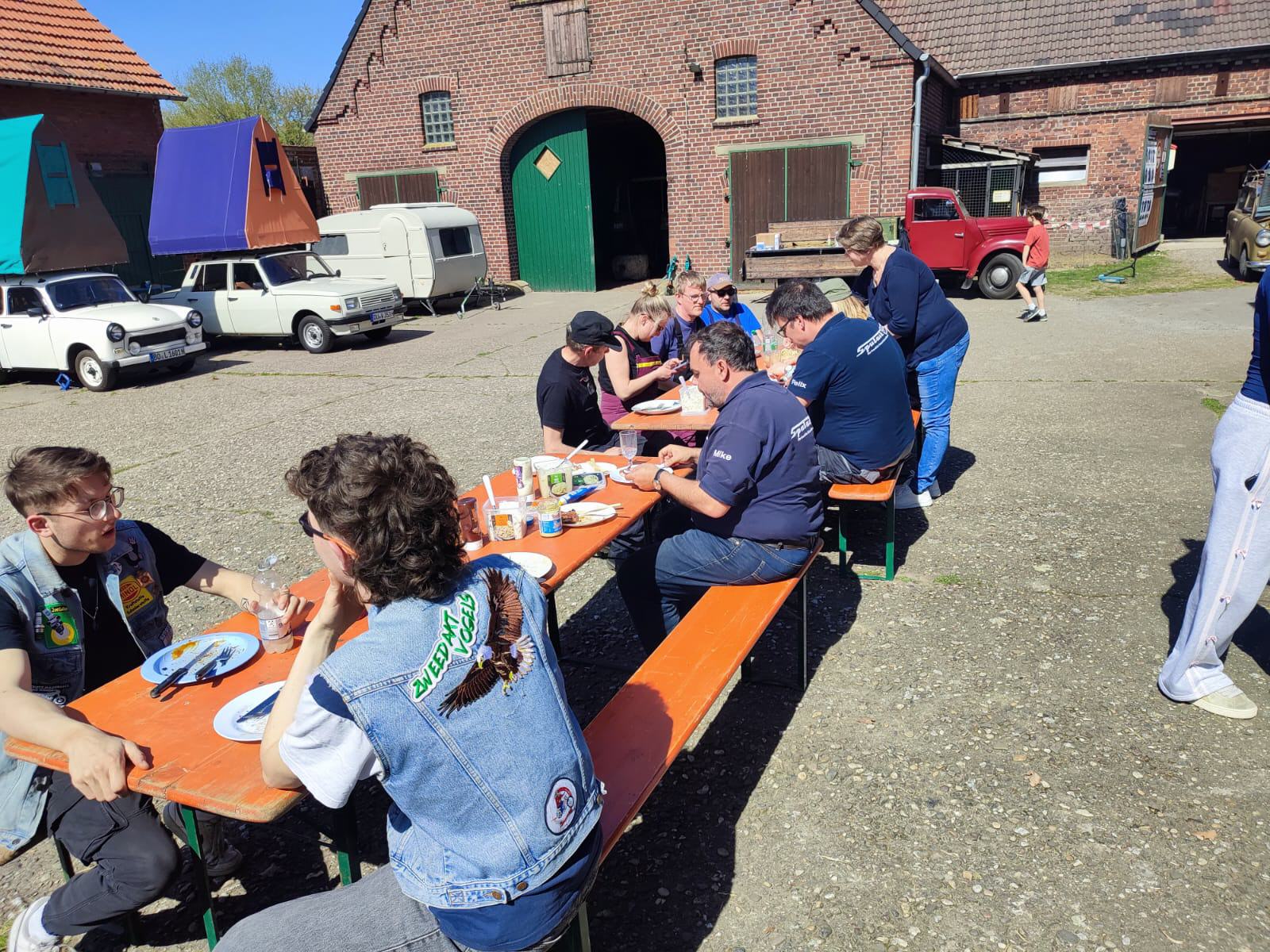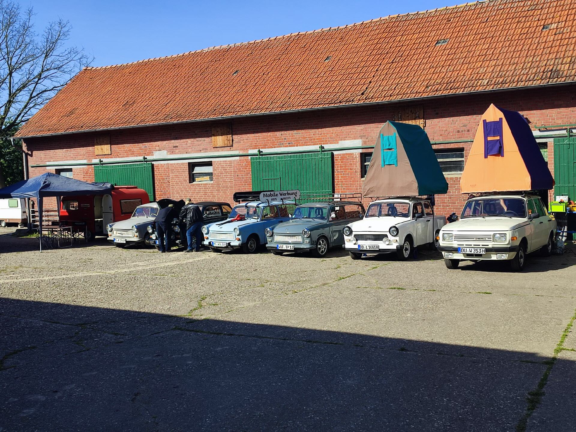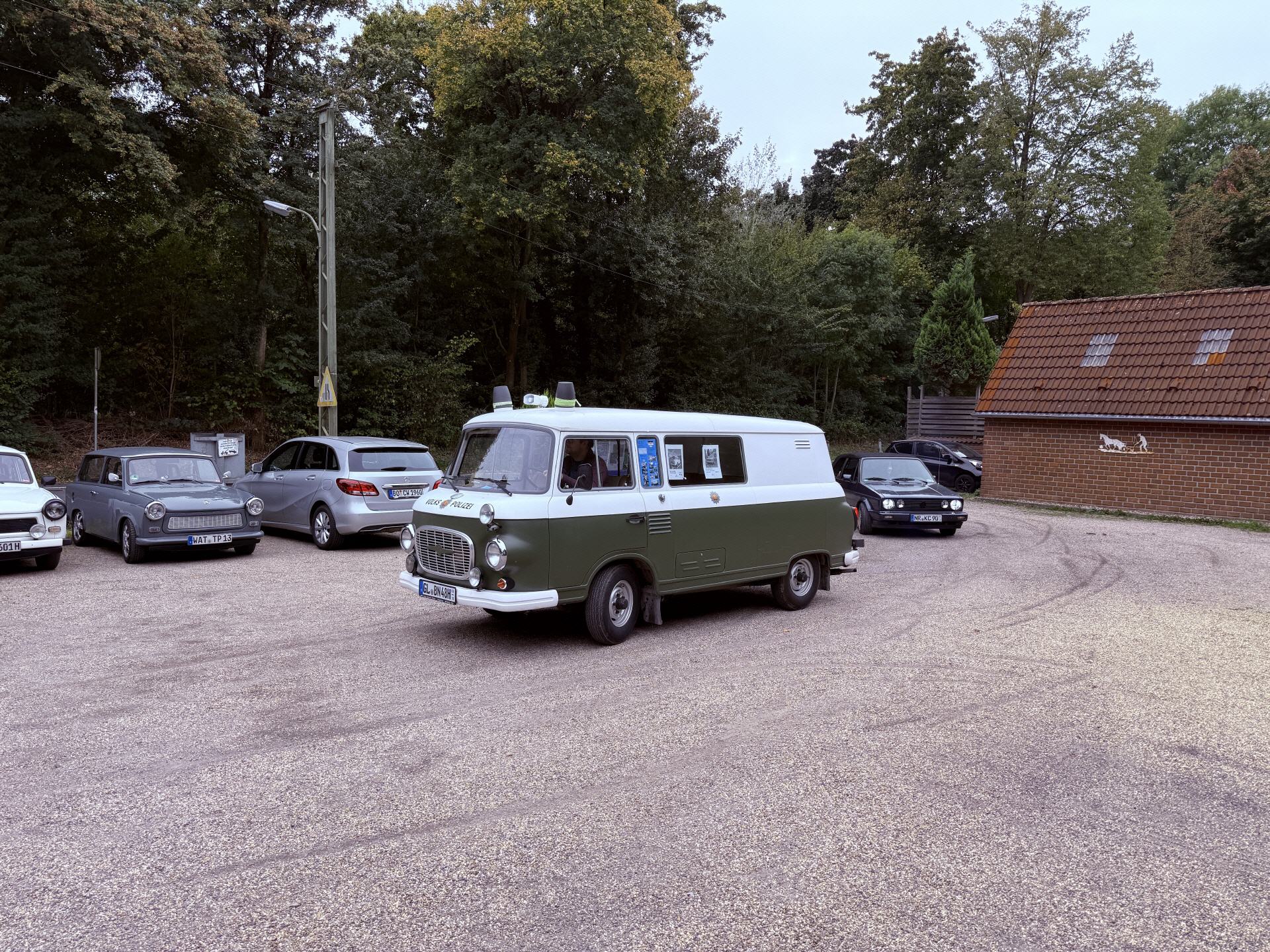 Unser erstes Ziel war ein Oldtimertreffen bei Marcs Classic Cars in Dortmund. Schon bei der Ankunft war klar: Unsere Ostblech-Kolonne war der Star des Tages. Kaum hatten wir das Gelände befahren, stürmten neugierige Besucher zu unseren Fahrzeugen – ein Zeichen dafür, dass der Charme des Trabis ungebrochen ist. Wir ergatterten noch ein schönes Plätzchen, an dem wir unsere Autos würdig präsentieren konnten.