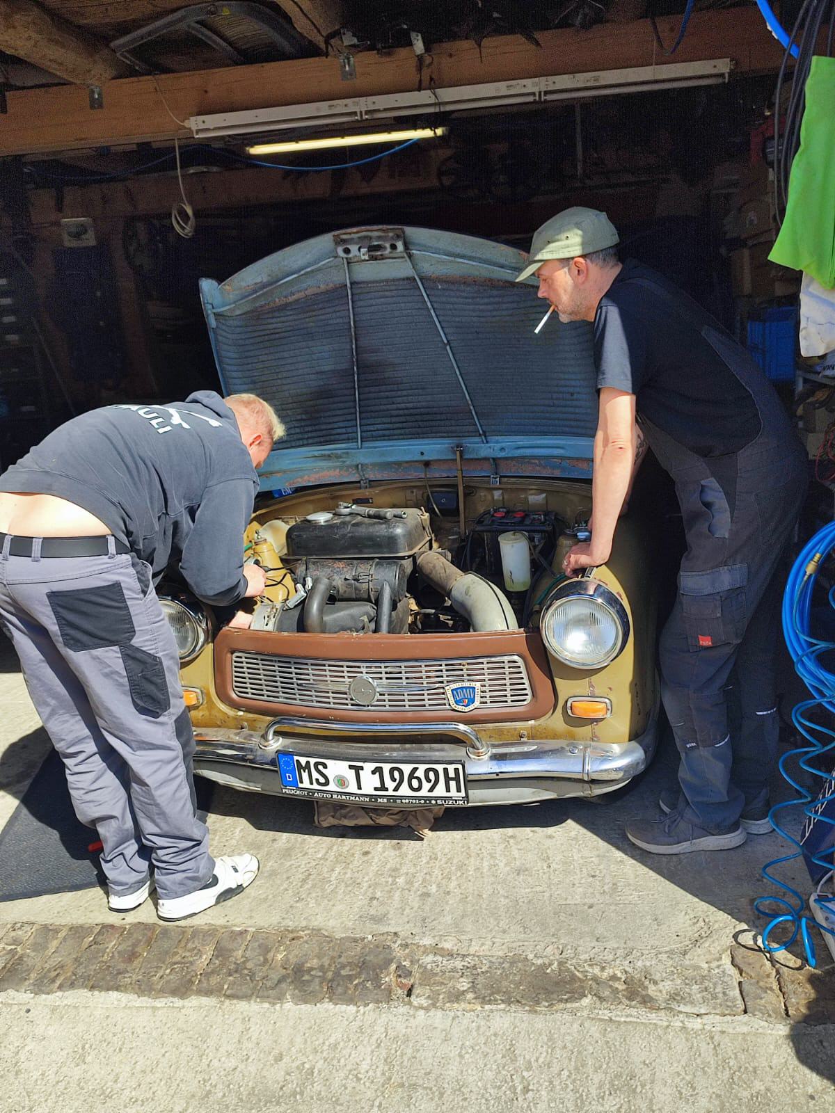Bei mehrmaligen Spritztouren mit dem Trabant Cabrio stellte sich heraus, dass die Batterie defekt war. Zum Glück war immer jemand dabei, der anschieben konnte. Also sind wir erstmal zu irgendeiner Werkstatt in Winterswijk gefahren. Hier wurden wir von drei sehr netten niederländischen KFZ-Mechanikern empfangen. Es war ein sehr lustiges Zusammentreffen, das erstmal mit einer Kaffeepause begann. Nachdem die Batterie eingebaut war, musste der Chef noch eine entsprechende Probefahrt machen, bei der er sich gar nicht mal so schlecht angestellt hat.
